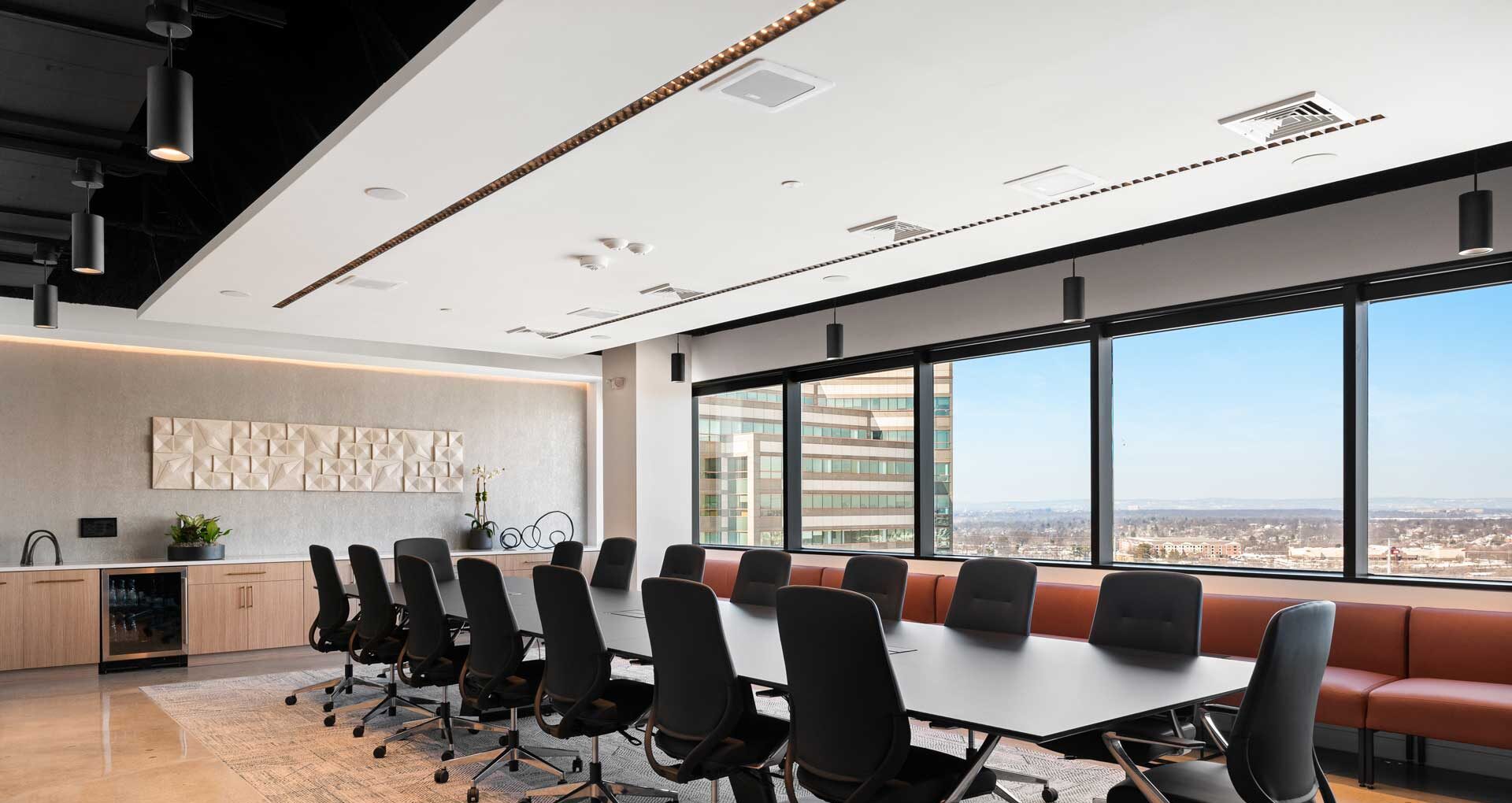 Window office at LS Power workplace retreat in East Brunswick, with workstation, round meeting table, and floor-to-ceiling exterior views
