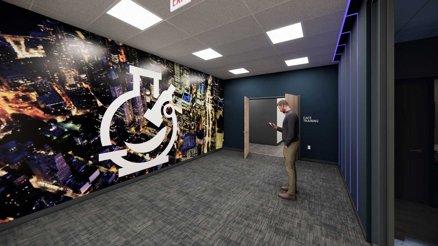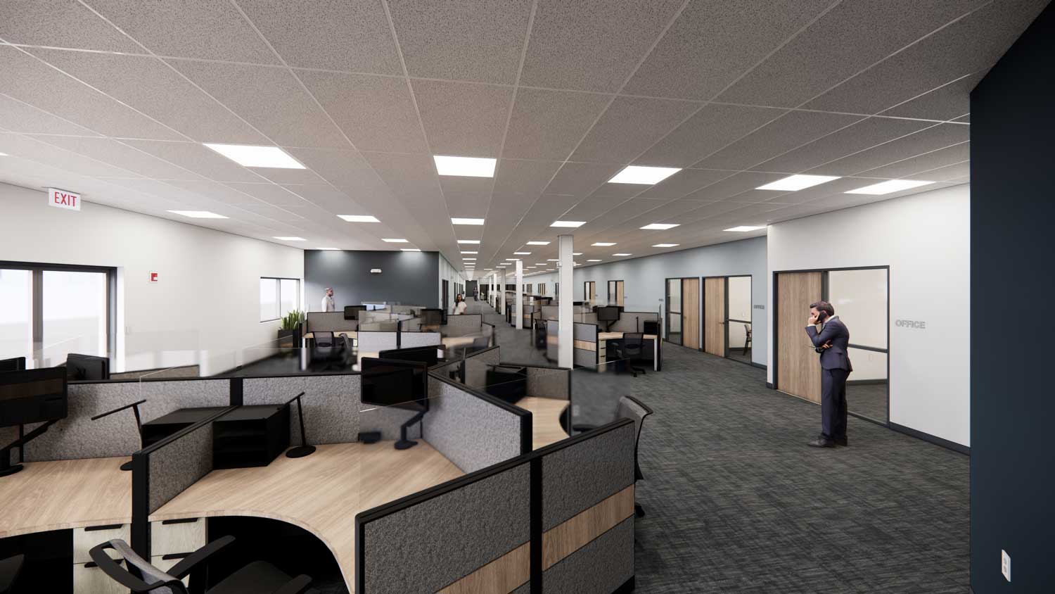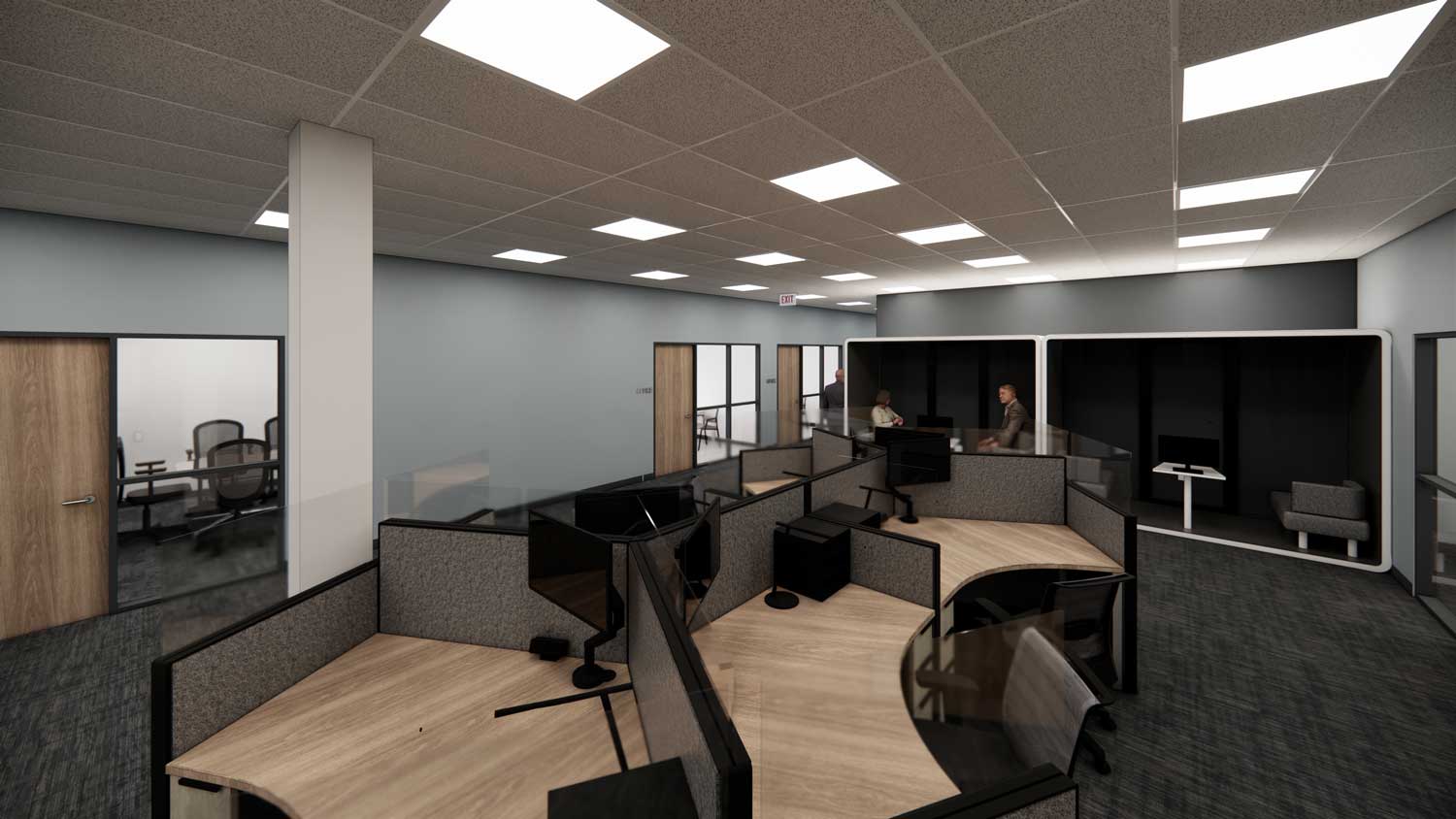 These visuals are architectural renderings created by RI Workplace to help the client envision their future space.