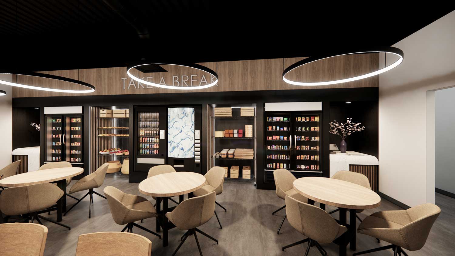 • Multiple cafés with hospitality-inspired finished, healthy snacks and drinks and on-site vending machines