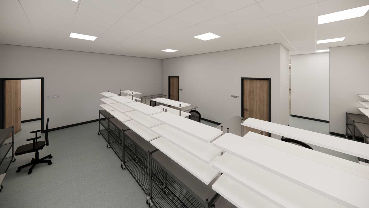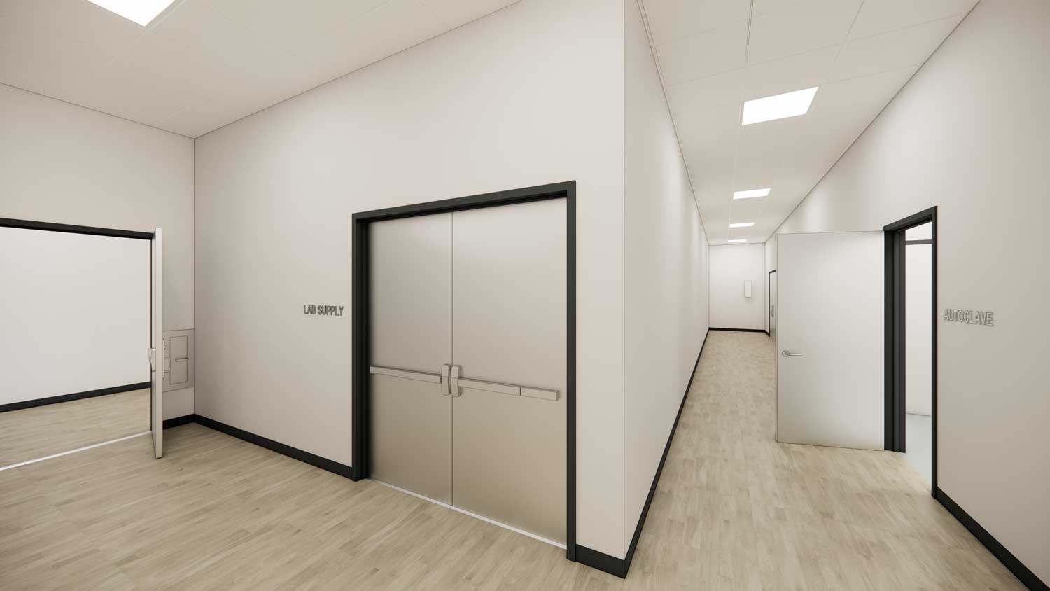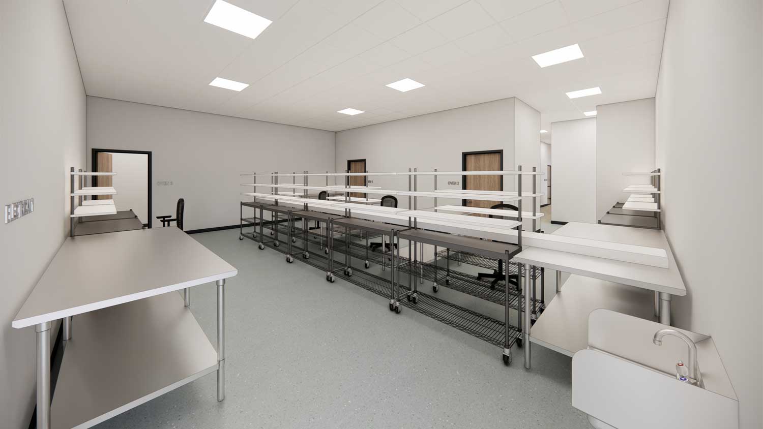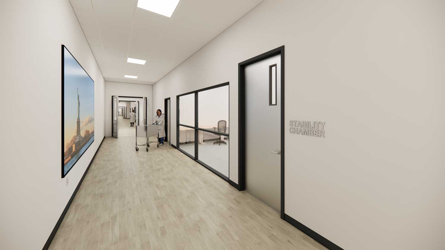 • Lab tech station, stability chamber, lab gas and supply rooms